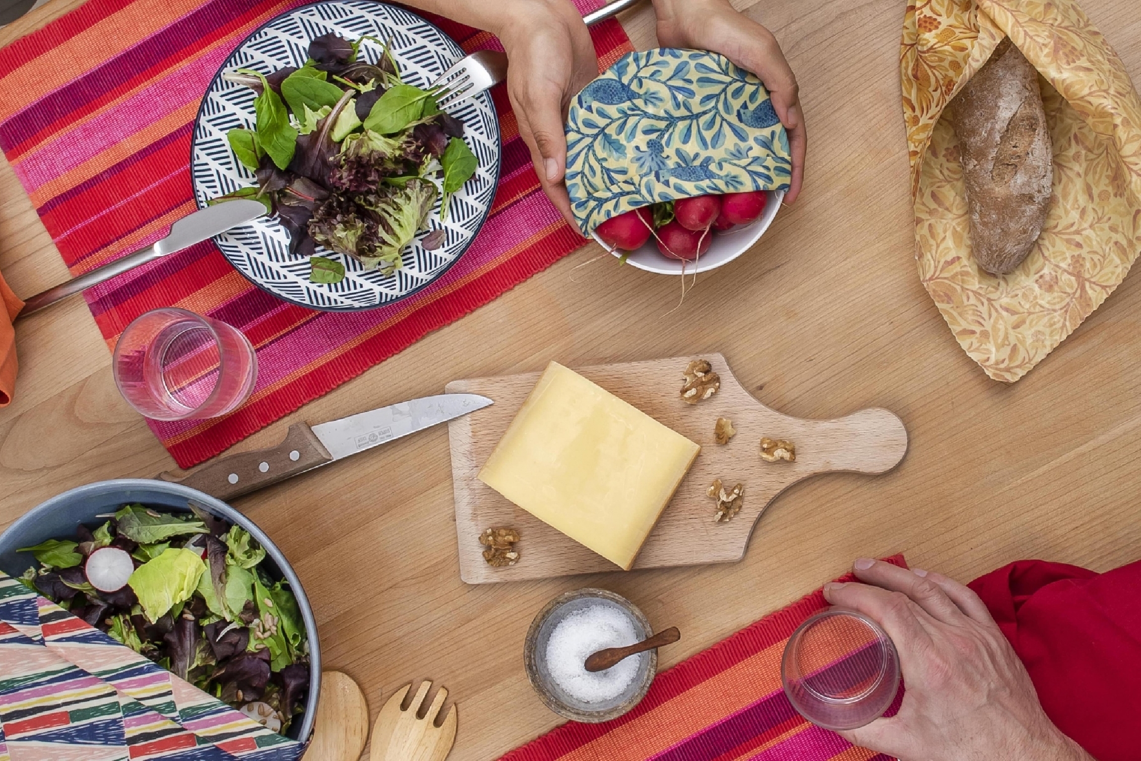 Mit unseren drei Grössen Small, Medium und Large können Sie eine breite Palette Ihres Küchengeschirrs abdecken. Es können damit ebenfalls diverse Lebensmittel eingewickelt werden. Wussten Sie, dass Bienenwachs dem Stoff selbsthaftende Eigenschaften verleiht? Indem Sie ihn mit dem Handballen aufdrücken, legt er sich um den äusseren Rand des gewählten Behälters. Der Stoff ist nicht für einen direkten Kontakt mit rohem Fleisch oder Fisch geeignet. Nur mit kaltem Wasser waschen. Kontakt mit jeglicher Wärmequelle vermeiden.